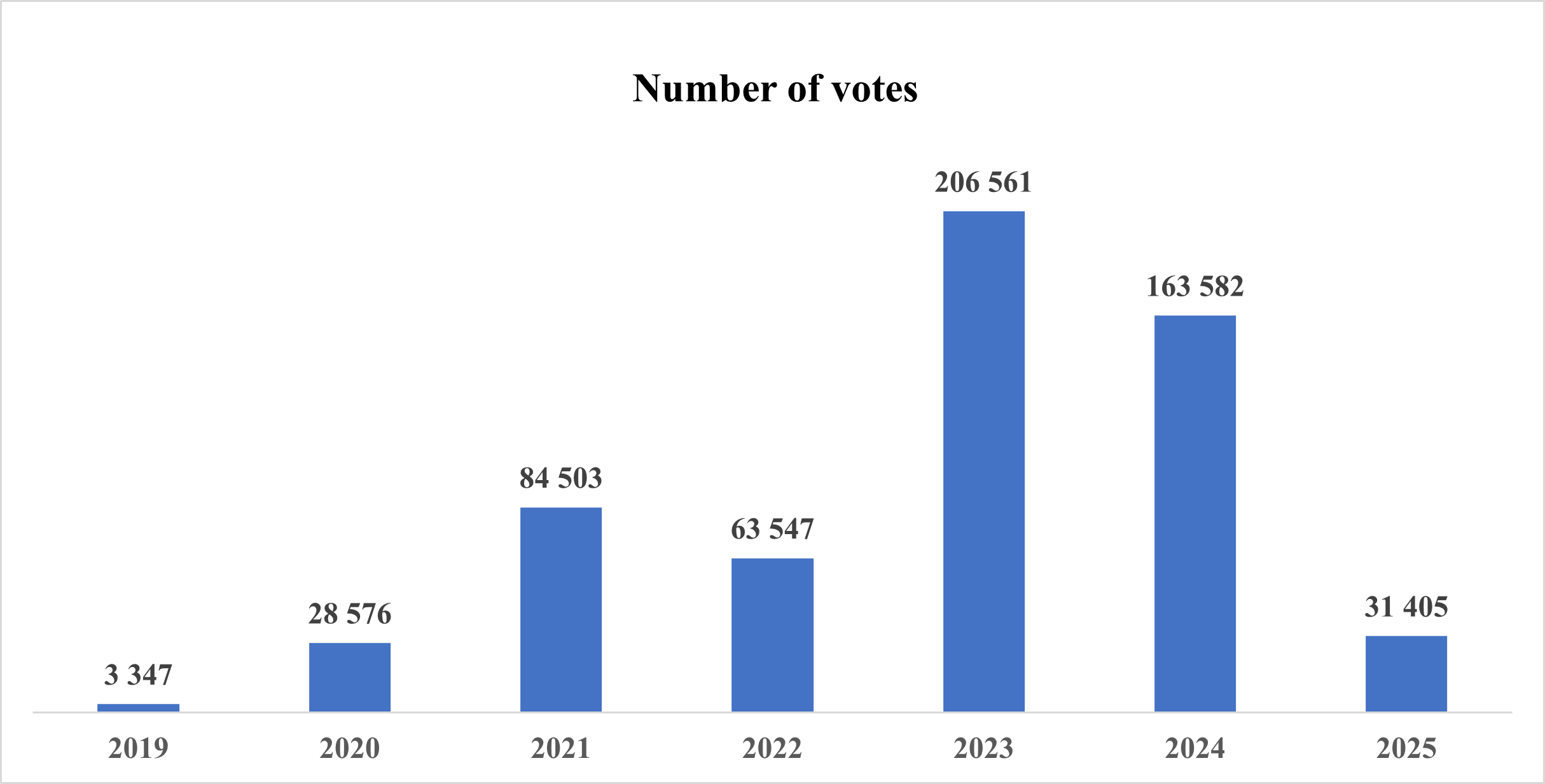 The number of submitted applications, the number of votes received, and the amount of funds allocated for project implementation by year are presented in the diagrams below.