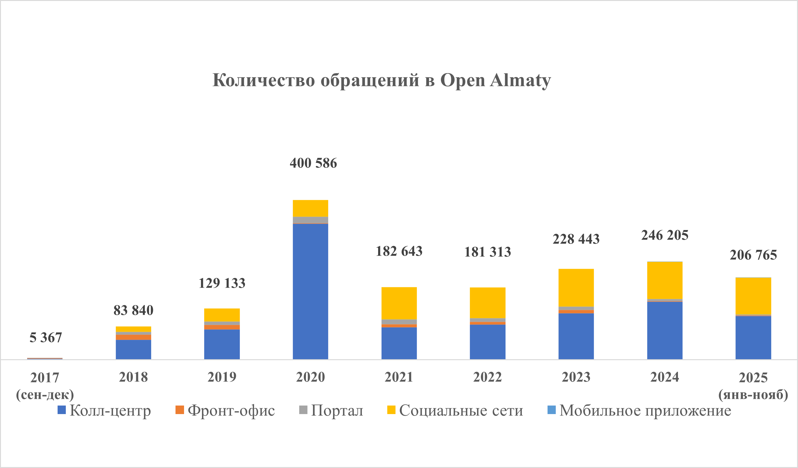 С начала деятельности «Open Almaty» поступило более 1,6 млн обращений. Порядка 93% обращений приходится на соцсети и колл-центр.