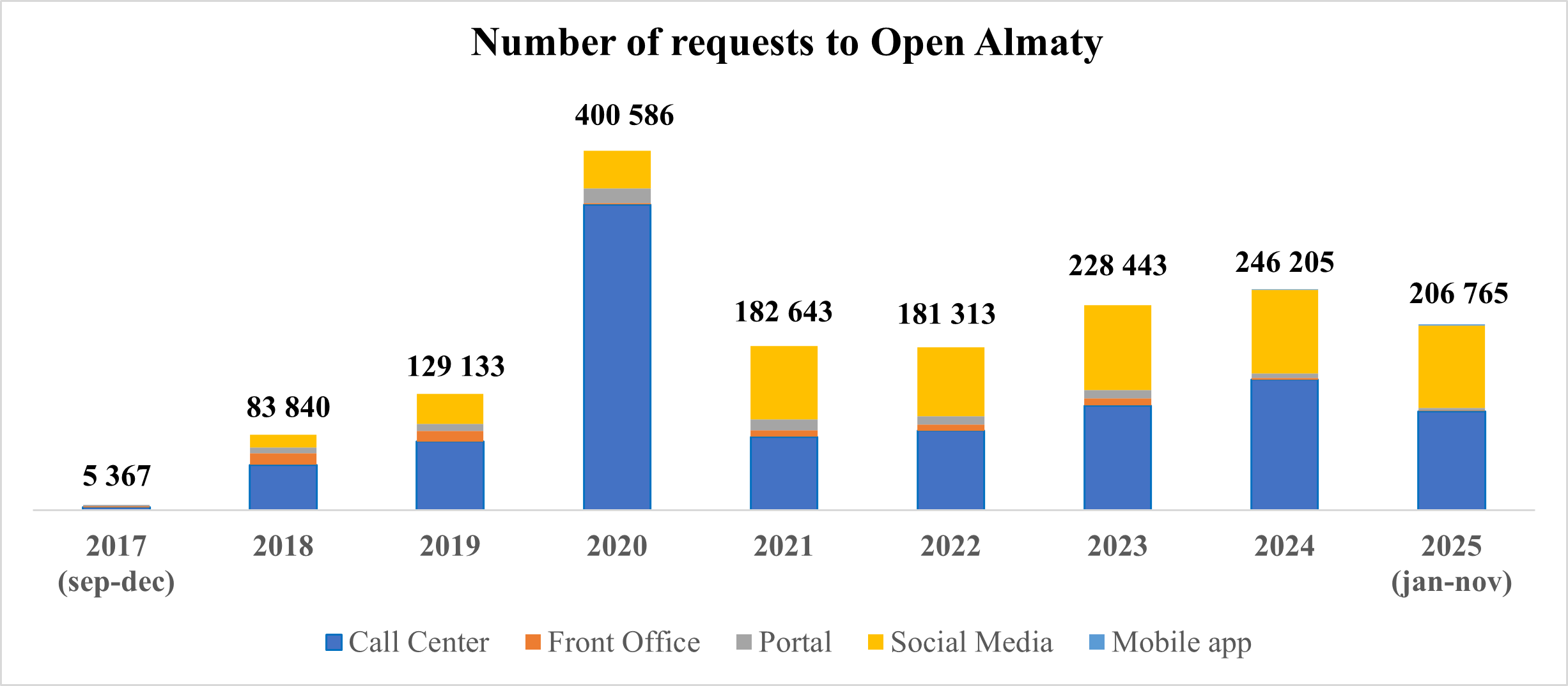 Since the beginning of Open Almaty activity, more than 1,6 million requests have been received. About 93% of requests come from social networks and the call center.