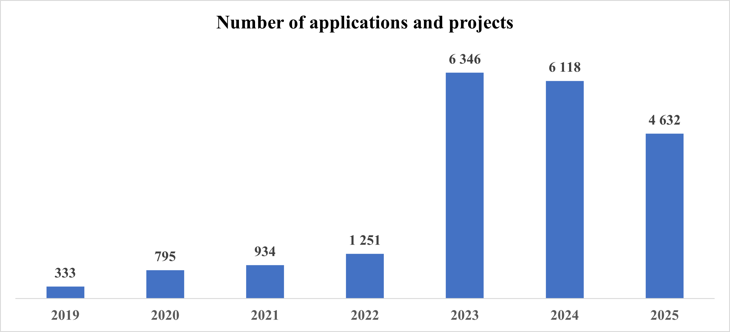 The number of submitted applications, the number of votes received, and the amount of funds allocated for project implementation by year are presented in the diagrams below.