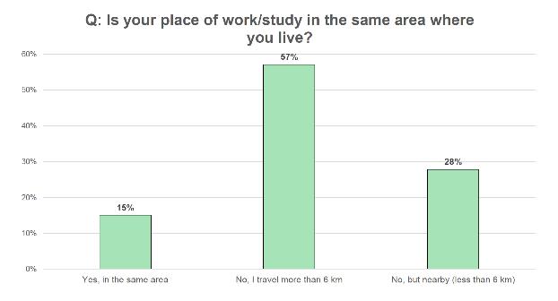 Commute time: Around 60% of the respondents in the city have to travel more than 6 kilometers to work. This indicates a significant number of people living in suburban or outskirts areas, which increases travel time and the need for transfers.