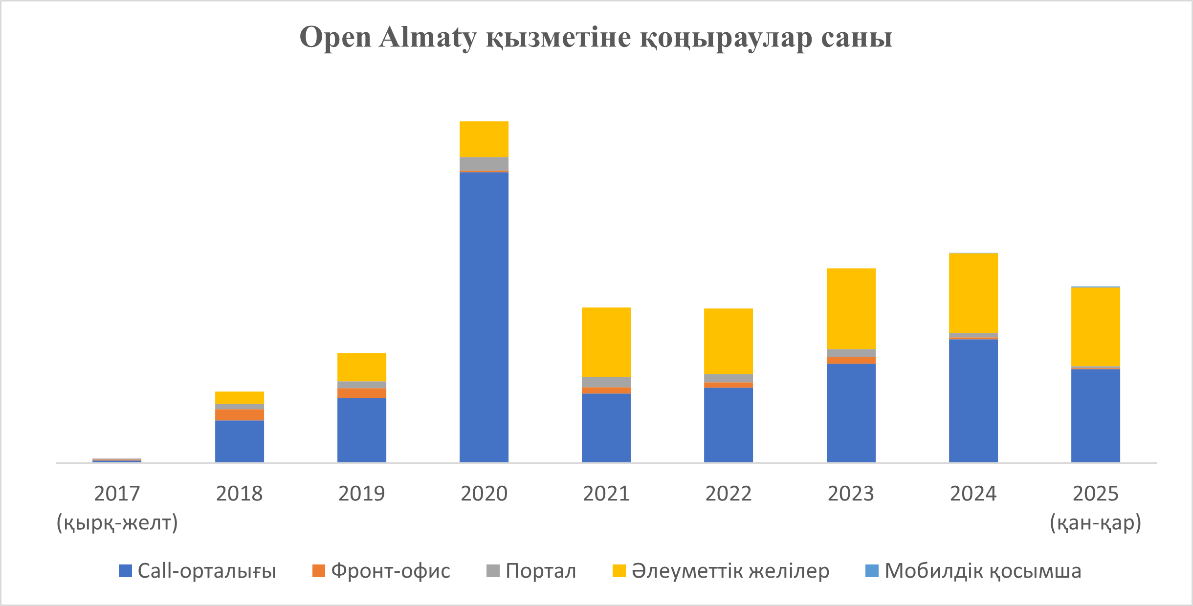 «Open Almaty» қызметі басталғаннан бері 1,6 млн-нан астам өтініш келіп түсті. Өтініштердің шамамен 93%-ы әлеуметтік желілер мен колл-орталыққа тиесілі.