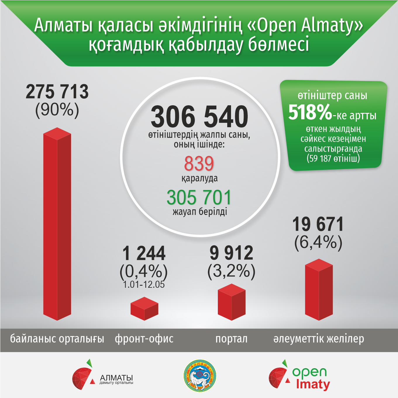 2020 жылғы қаңтар-маусым аралығында Алматы қаласы әкімдігінің «Open Almaty» қоғамдық қабылдау бөлмесіне (Алматы қаласын дамыту орталығының жобасы) тұрғындардан 306,5 мыңнан астам өтініш түсті. Бүгінде олардың 0,3%-і қаралу үстінде, қалғандары бойынша жауап берілді.