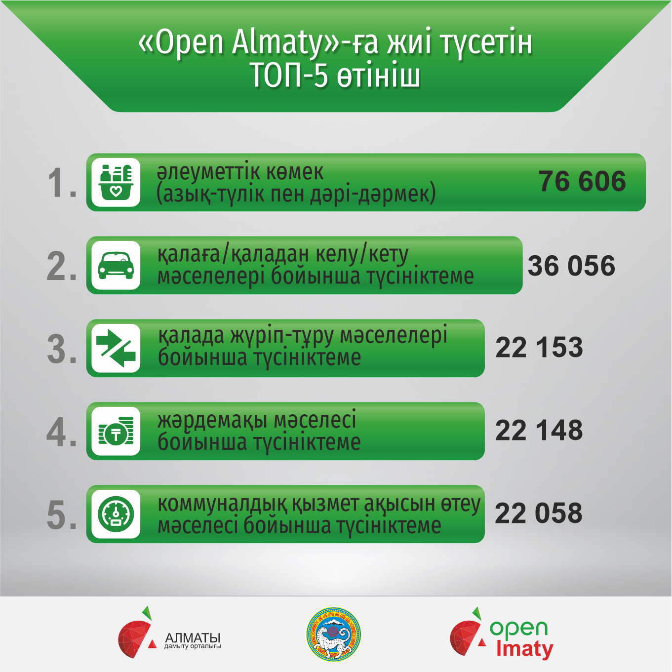 Топ-5 өтініш келесідей: тұрғындардың азық-түлік және дәрі-дәрмек түріндегі әлеуметтік көмек алуға өтінімдері (76,6 мың), Алматыға келу/кету (36 мың), Алматы бойынша жүріп-тұру (22,2 мың), жәрдемақы алу (22,1 мың) және коммуналдық қызмет ақысын өтеу (22 мың) мәселелері бойынша түсініктемелер.
