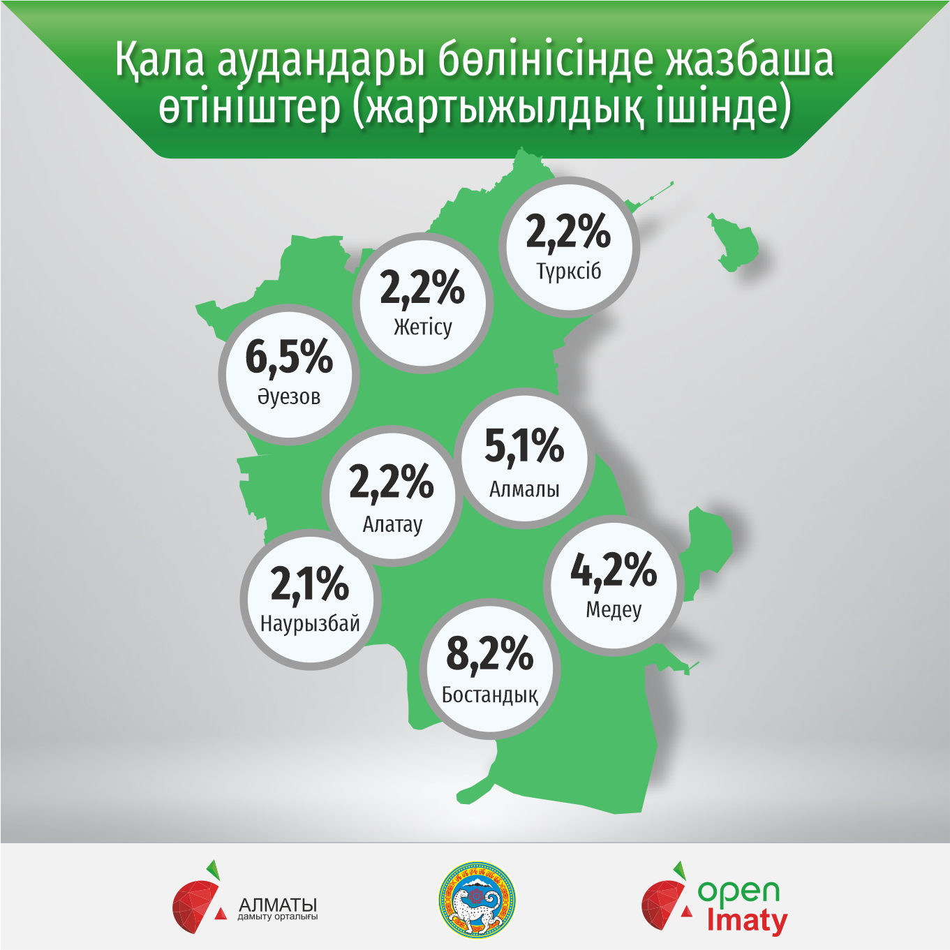 Қала аудандары бөлінісінде ең көп жазбаша өтініштер Бостандық ауданы әкімі аппаратының атына келіп түсті – жартыжылдықтағы барлық жазбаша өтініштер жалпы санының 8,2%-і. Одан кейінгі кезекте Әуезов (6,5%), Алмалы (5,1%), Медеу (4,2%), Алатау (2,2%), Жетісу (2,2%), Түрксіб (2,2%) және Наурызбай (2,1%) ауданы әкімдерінің аппараттары.