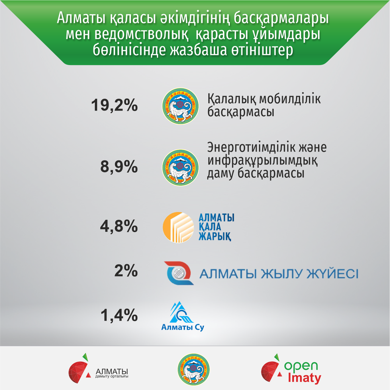 Алматы әкімдігінің басқармалары мен ведомстволық қарасты ұйымдары бөлінісінде жазбаша өтініштердың көбі Қалалық мобилділік басқармасына (19,2%), Энерготиімділік және инфрақұрылымдық даму басқармасына (8,9%), сондай-ақ Алматы Қала Жарық (4,8%), Алматы жылу жүйесі (2%) және Алматы Судың (1,4%) атына келіп түсті.