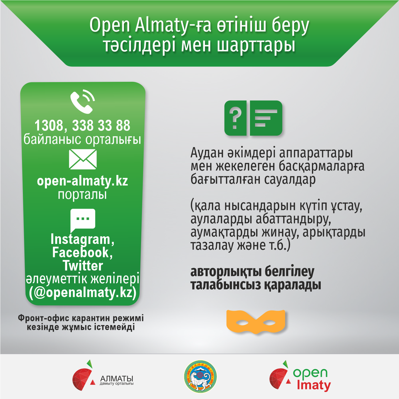 Бүгінде қала тұрғындары мен қонақтарына Open Almaty-ға өтініш берудің келесі тәсілдері қолжетімді: 1308, 338 33 88 байланыс орталығы, open-almaty.kz порталы мен Instagram, Facebook, Twitter әлеуметтік желілері (@openalmaty.kz). Фронт-офис карантин режимі кезінде жұмыс істемейді.