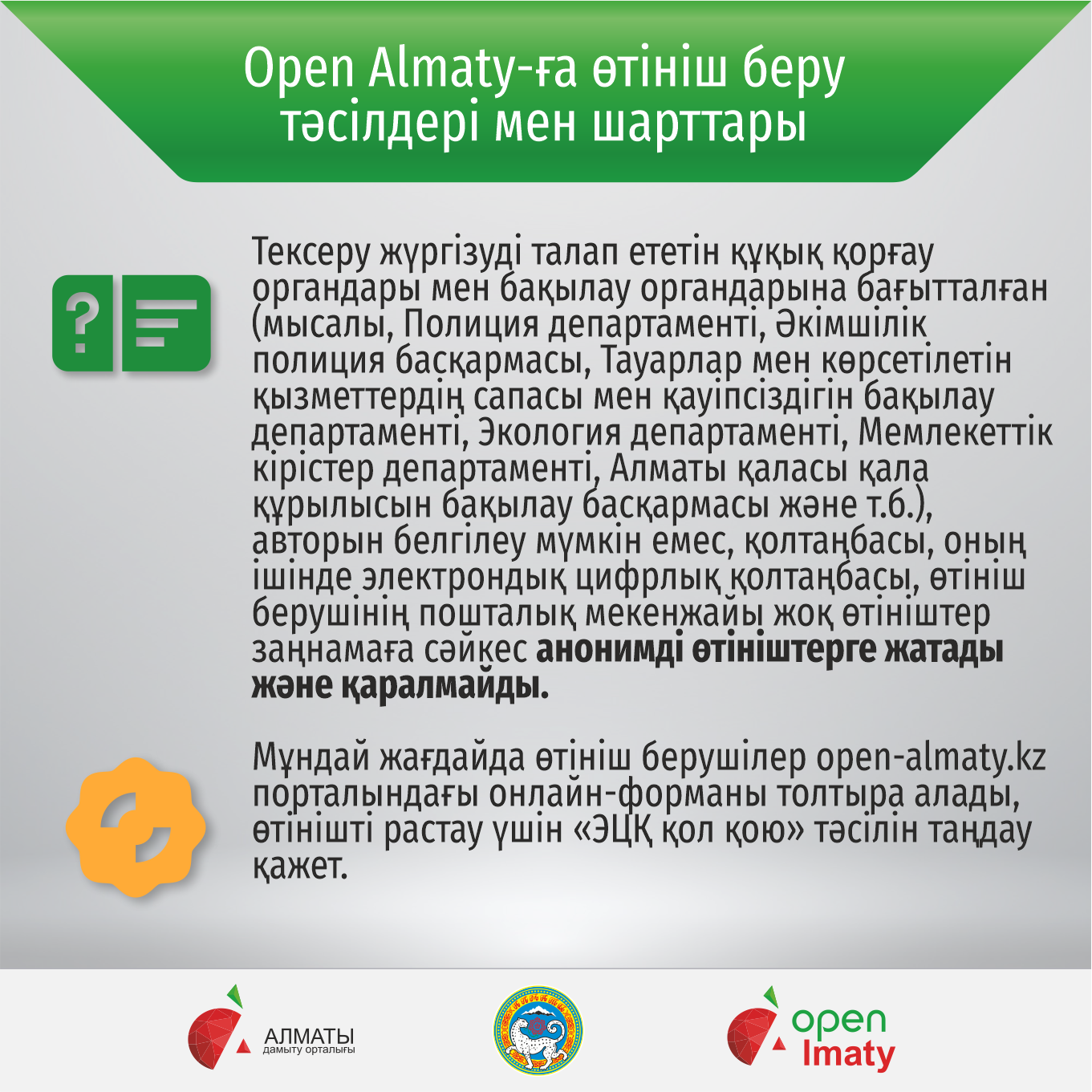 Тексеру жүргізуді талап ететін құқық қорғау органдары мен бақылау органдарына бағытталған (мысалы, Полиция департаменті, Әкімшілік полиция басқармасы, Тауарлар мен көрсетілетін қызметтердің сапасы мен қауіпсіздігін бақылау департаменті, Экология департаменті, Мемлекеттік кірістер департаменті, Алматы қаласы қала құрылысын бақылау басқармасы және т.б.), авторын белгiлеу мүмкiн емес, қолтаңбасы, оның iшiнде электрондық цифрлық қолтаңбасы, өтініш берушiнiң пошталық мекенжайы жоқ өтiнiштер заңнамаға сәйкес анонимді өтініштерге жатады және қаралмайды. Мұндай жағдайда өтініш берушілер open-almaty.kz порталындағы онлайн-форманы толтыра алады, өтінішті растау үшін «ЭЦҚ қол қою» тәсілін таңдау қажет.
