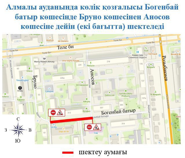 31 мамырдан 20 шілдеге дейін Алмалы ауданында Бөгенбай батыр көшесінің Бруно көшесінен Аносов көшесіне дейінгі бөлігінде екі бағытта да көлік қозғалысы шектеледі.