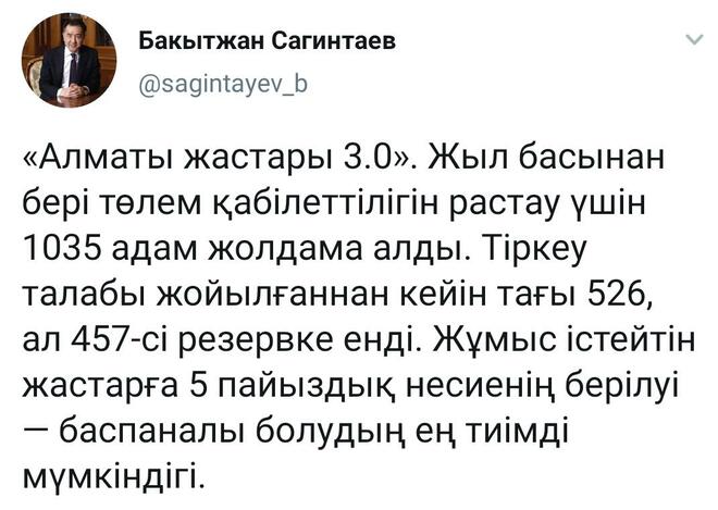 «Алматы жастары 3.0». Жыл басынан бері төлем қабілеттілігін растау үшін 1035 адам жолдама алды. Тіркеу талабы жойылғаннан кейін тағы 526 жолдама алады, ал 457-сі резервке енді. Жұмыс істейтін жастарға 5 пайыздық несиенің берілуі – баспаналы болудың ең тиімді мүмкіндігі», - деп жазды қала әкімі.
