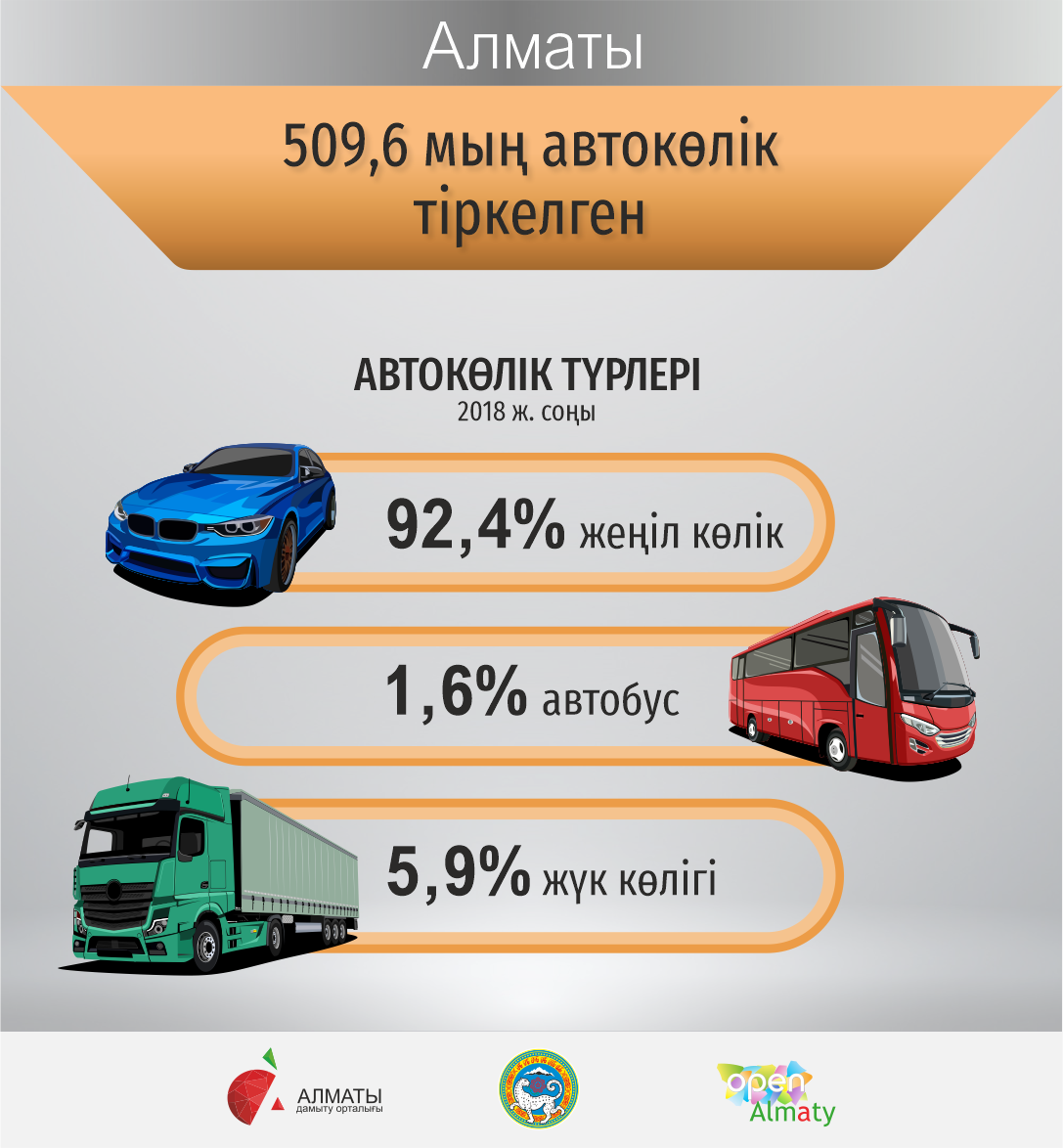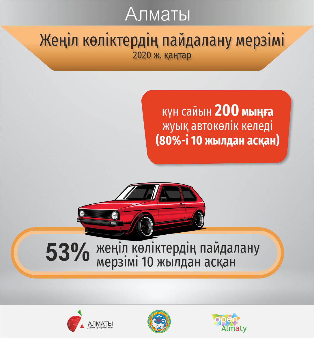 2020 жылдың басындағы жағдай бойынша Алматыда 470 мыңнан астам жеңіл автокөлік тіркелген, бұл ретте жартысынан астамының (250,2 мың) пайдалану мерзімі 10 жылдан асқан.