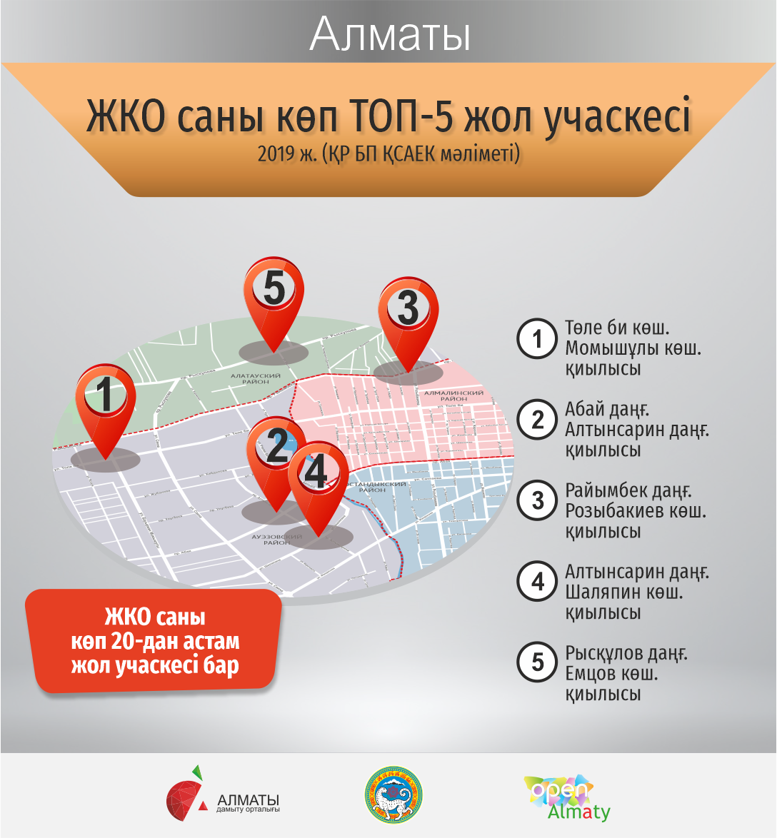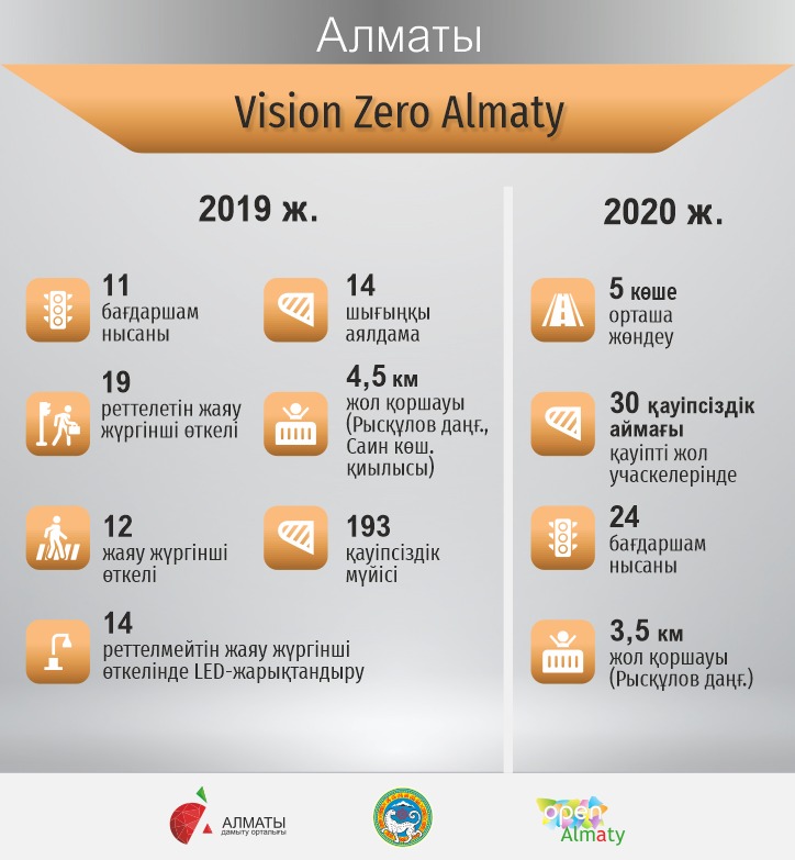 ЖКО санын азайту үшін «VisionZeroAlmaty» іс-қимыл жоспары аясында реттелетін жаяу жүргінші өткелдері мен бағдаршам нысандары, шығыңқы аялдамалар, қауіпсіздік мүйістері салынды, реттелмейтін жаяу жүргінші өткелдеріне LЕD-жарықтандыру орнатылды және т.б. Биыл бағдаршам нысандарын орнату, көшелерді орташа жөндеу, қауіпті жол учаскелерінде қауіпсіздік аймақтарын салу, реттелмейтін жаяу жүргінші өткелдерін жарықтандыру жұмыстары жалғасуда.