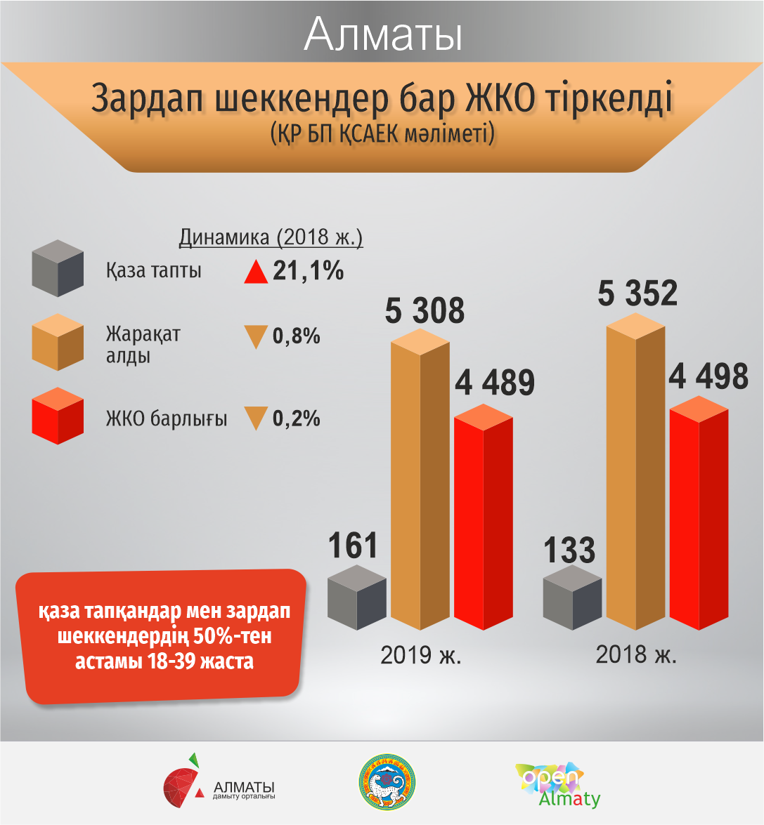 ҚР Бас прокуратурасының Құқықтық статистика және арнайы есепке алу жөніндегі комитетінің (ҚР БП ҚСАЕК) мәліметі бойынша, 2019 жылы Алматыда зардап шеккендер бар 4 489 ЖКО тіркеліп (2018 ж. – 4 498), 161 адам (2018 ж. - 133) қаза тапты, 5 308 адам (2018 ж. – 5 352) жарақат алды.