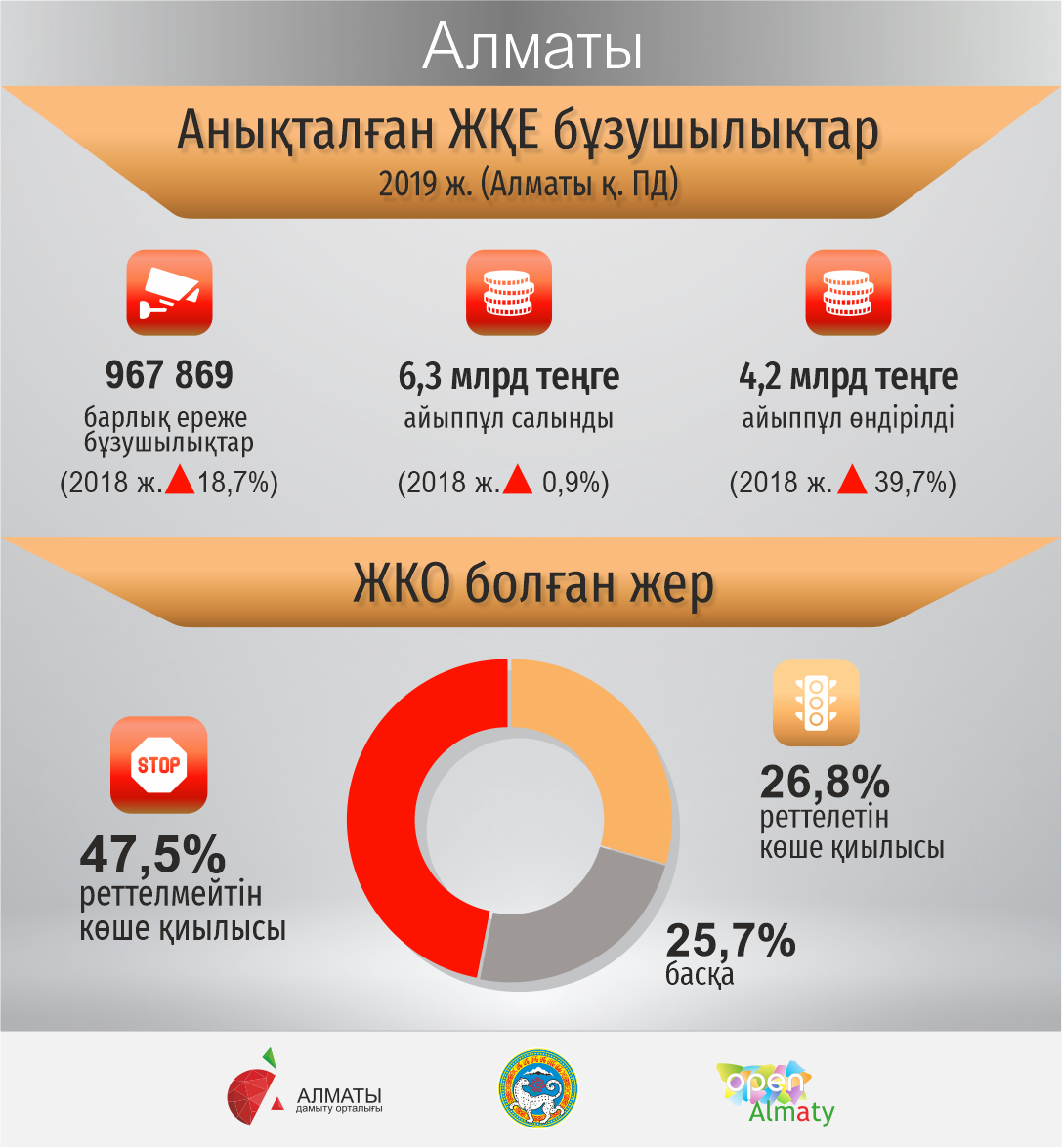 Алматы қ. ПД мәліметі бойынша, 2019 жылы жол қозғалысы ережесін бұзудың 967,9 мың дерегі анықталды, бұл 2018 жылға қарағанда 18,7%-ке артық (815,1 мың). 6,3 млрд теңге сомасына айыппұл салынды (2018 ж. – 6,2 млрд теңге). 4,2 млрд теңге өндірілді (2018 ж. - 3 млрд теңге).