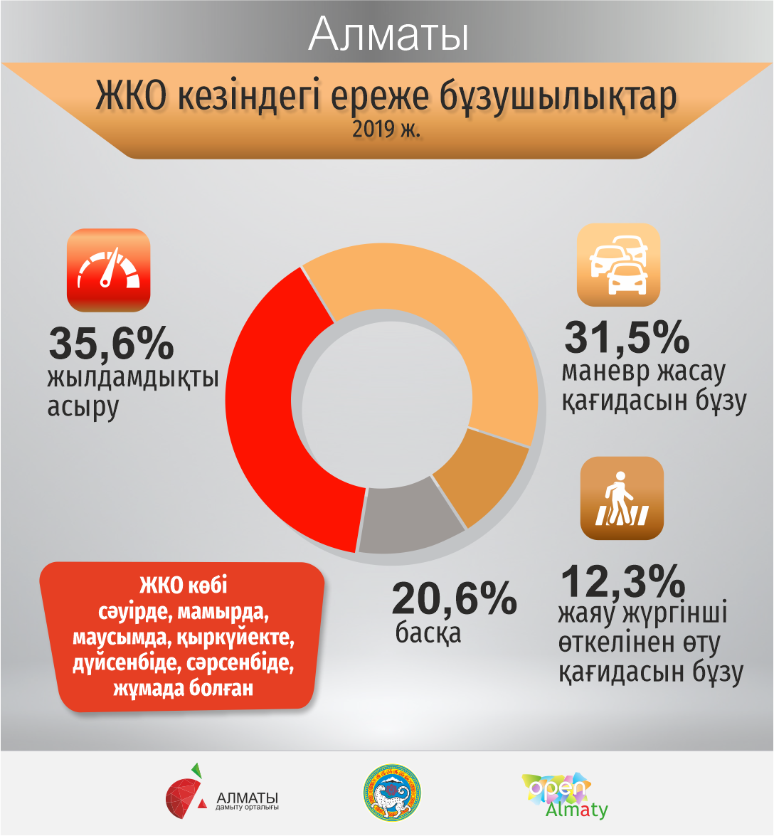 Барлық тіркелген ереже бұзушылықтардың үштен бірінен астамы – ЖҚЕ немесе жол белгілерімен белгіленген жылдамдықты арттыру (1605). ЖКО-ның тағы үштен бір бөлігі маневр жасау ережесін бұзу салдарынан болған, 12%-тен астамы – жаяу жүргінші өткелінен өту қағидасын бұзу (555).