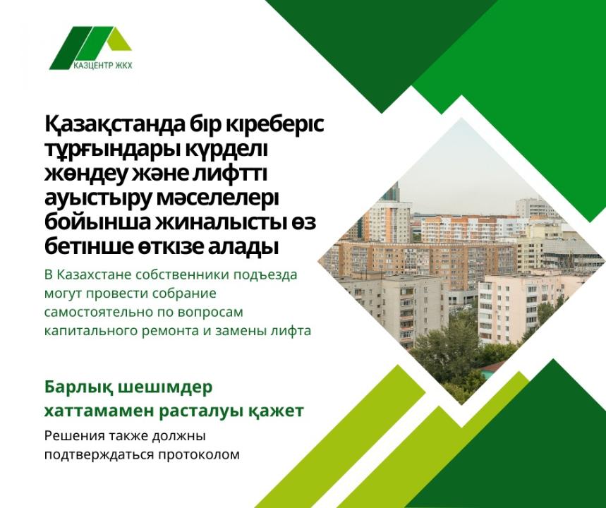 Кіреберіс күрделі жөндеу немесе лифтіні ауыстыру мәселелері бойынша шешім, осы кіреберістегі пәтерлер мен тұрғын емес үй-жайлардың жалпы санының үштен екісінен астамының келісімі болған жағдайда қабылданды деп есептеледі және тиісті хаттамамен рәсімделуі тиіс.
