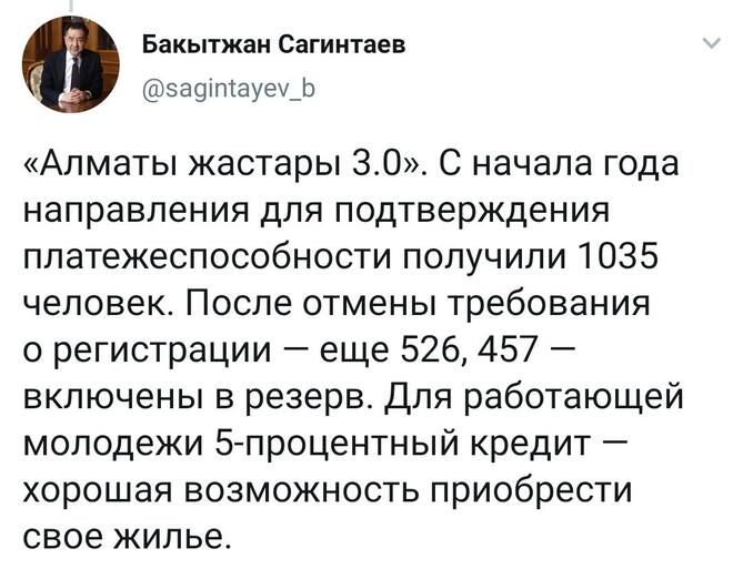 «Алматы жастары 3.0». С начала года направления для подтверждения платежеспособности получили 1035 человек. После отмены требования о регистрации — еще 526, 457 — включены в резерв. Для работающей молодежи 5-процентный кредит — хорошая возможность приобрести свое жилье», – написал аким города.