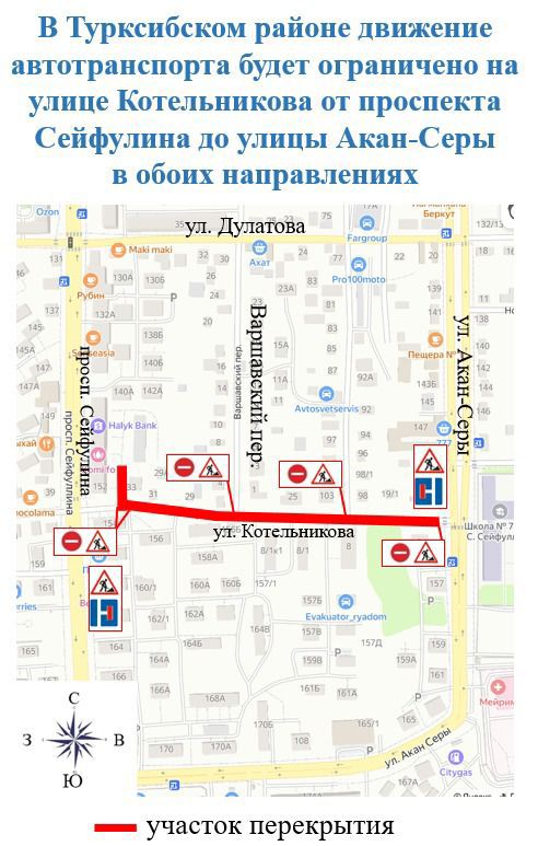 С 31 мая по 30 июня в Турксибском районе движение автотранспорта будет ограничено на улице Котельникова от проспекта Сейфуллина до улицы Акан-Серы в обоих направлениях.