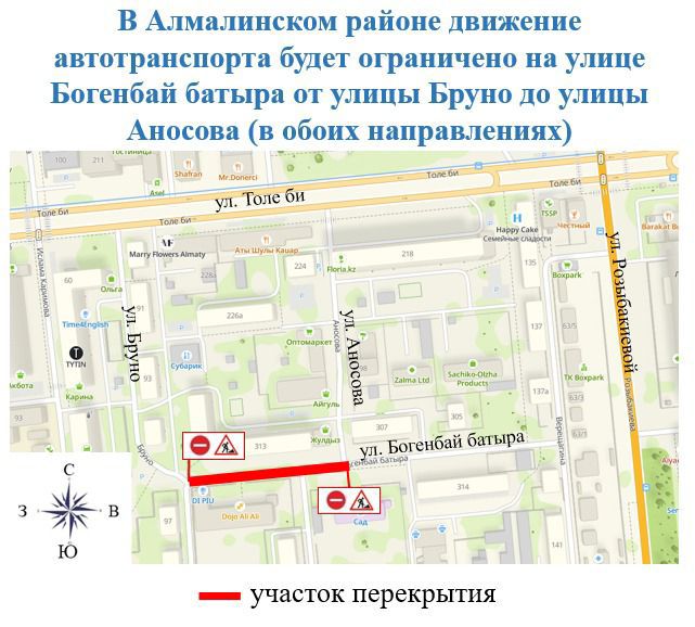 С 31 мая по 20 июля в Алмалинском районе движение автотранспорта будет ограничено на улице Богенбай батыра от улицы Бруно до улицы Аносова в обоих направлениях.