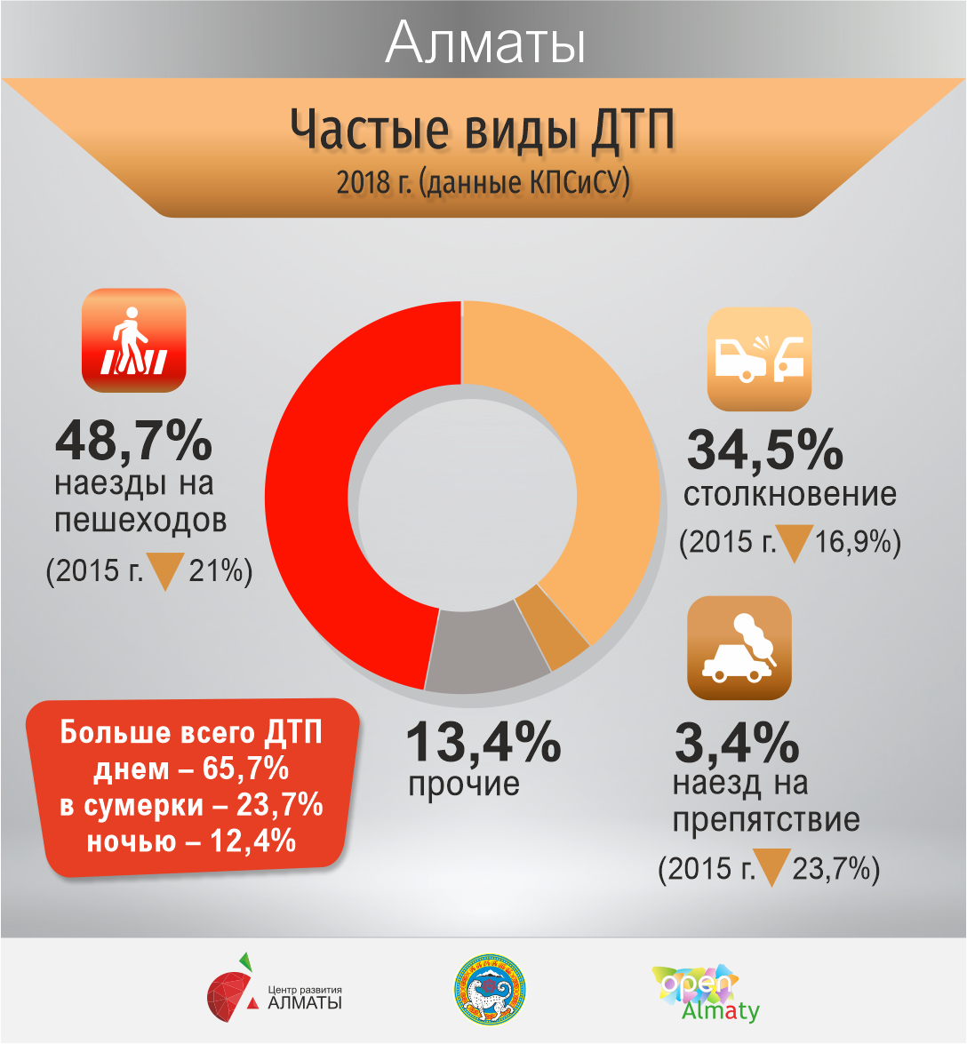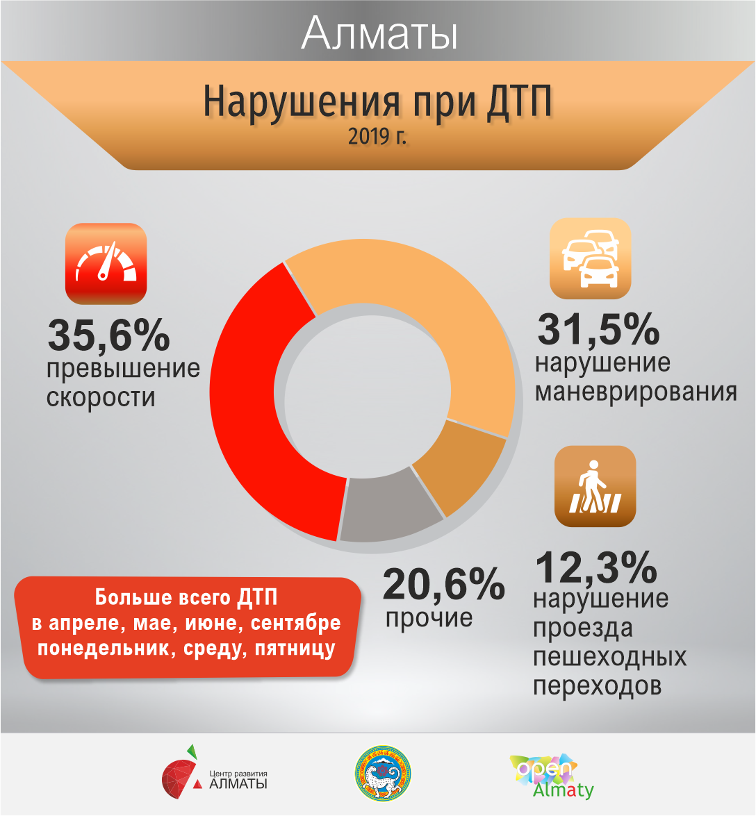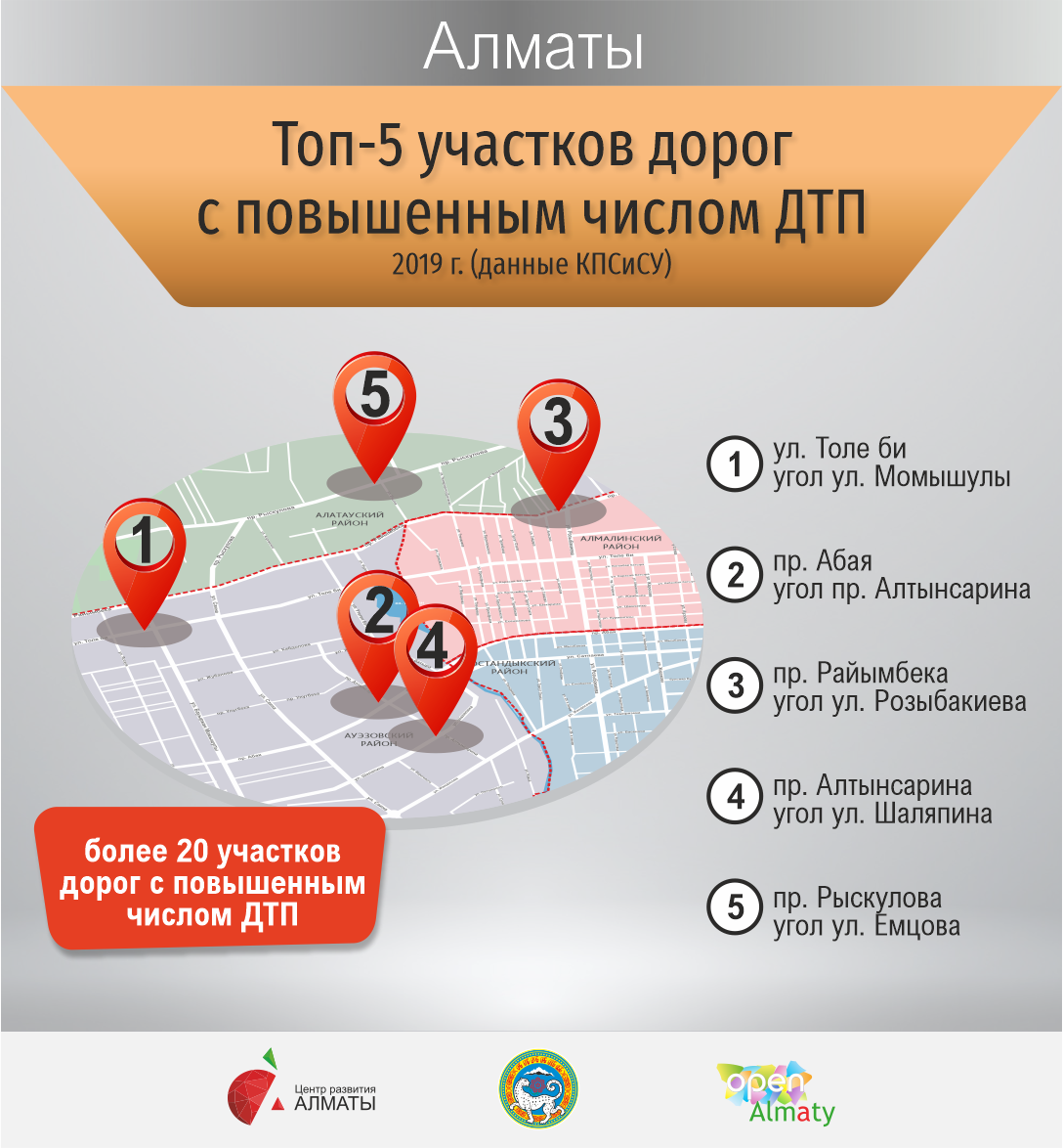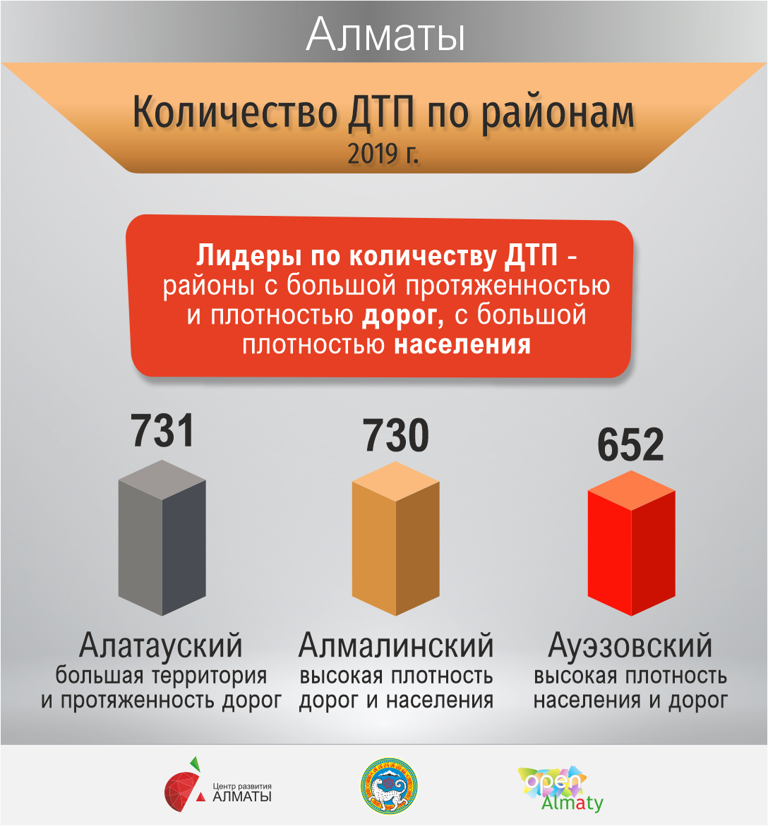 Так, территория Алатауского района – 1 место по количеству ДТП – самая большая и имеет наибольшую протяженность дорог. В Алмалинском районе – 2 место – самая высокая плотность дорог, при этом район находится на втором месте после Ауэзовского района по плотности населения, с высокой концентрацией офисных, торговых и других коммерческих помещений. Ауэзовский район – 3 место – самый плотно заселенный «спальный» район города, второй по плотности дорог после Алмалинского.