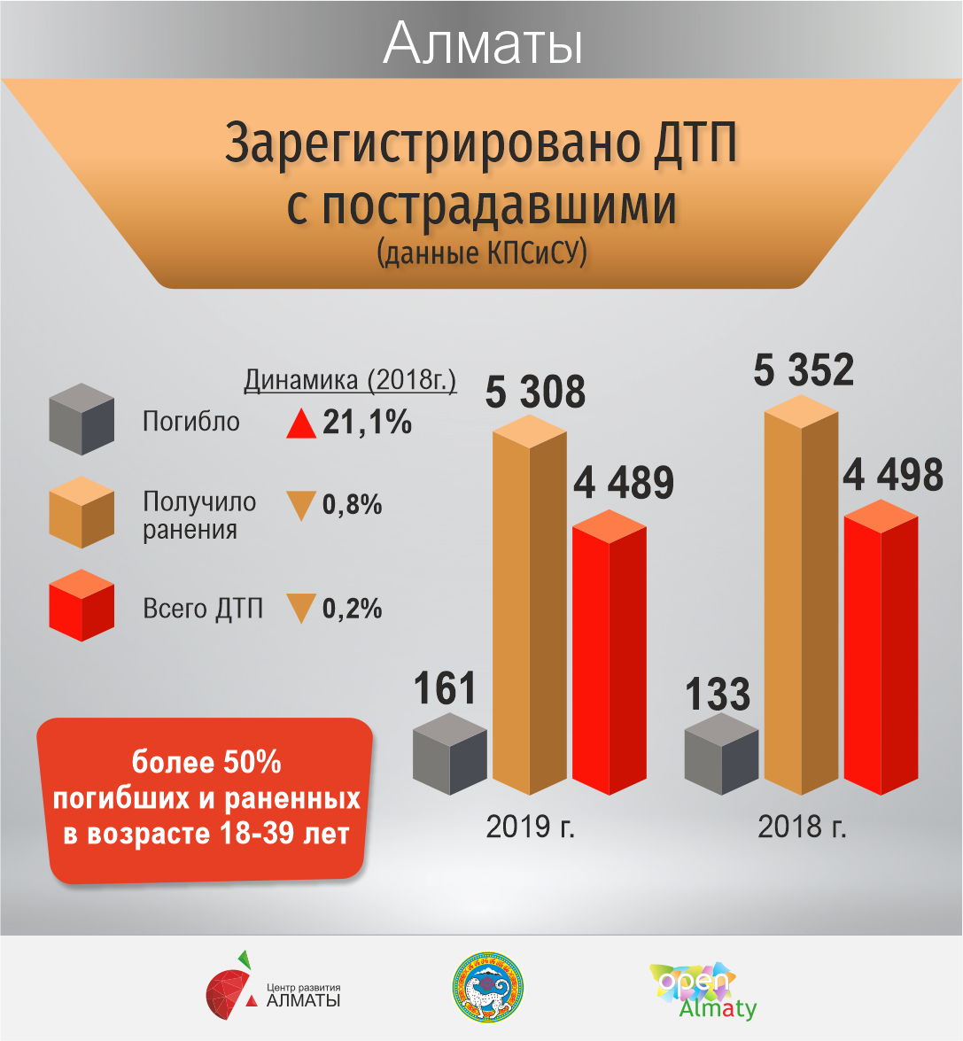 В 2019 г. в Алматы по данным Комитета по правовой статистике и специальным учетам Генеральной прокуратуры РК (КПСиСУ) зарегистрировано 4 489 ДТП с пострадавшими (2018 г.- 4498), в которых погиб 161 (2018 г. - 133) человек и 5 308 (2018 г. - 5352) получили ранения.