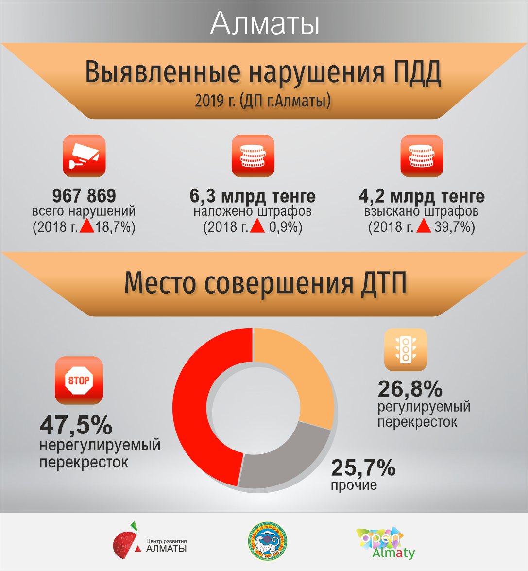 Всего в 2019 г., по данным ДП г. Алматы, выявлено 967,9 тыс. нарушений Правил дорожного движения, что на 18,7% больше, чем в 2018 г. (815,1 тыс.). Наложено штрафов на сумму 6,3 млрд тенге (2018 г. – 6,2 млрд тенге). Взыскано 4,2 млрд тенге (2018 г. - 3 млрд тенге).