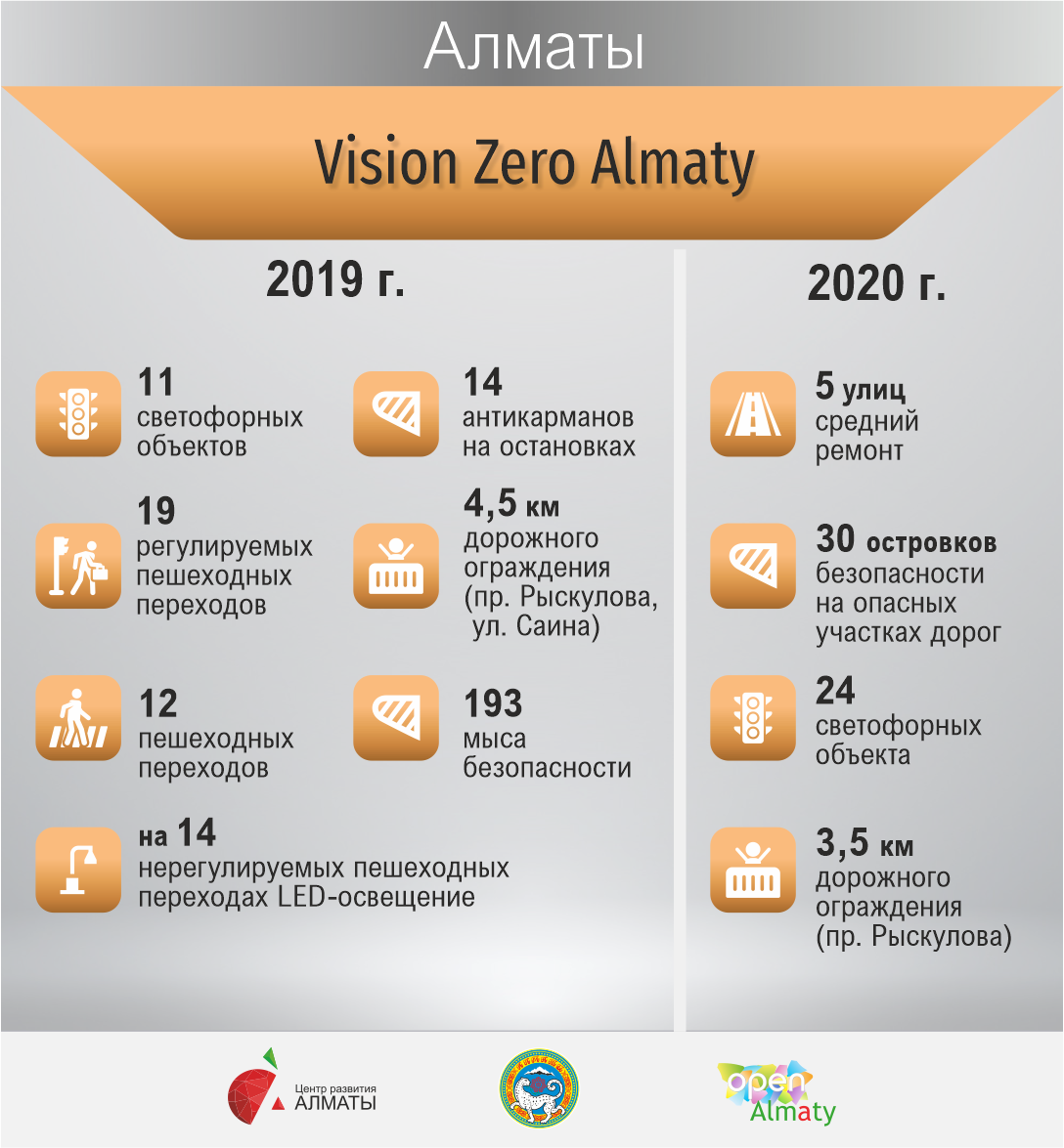 Для снижения количества ДТП в рамках плана действий «VisionZeroAlmaty» построены регулируемые пешеходные переходы и светофорные объекты, антикарманы на остановках, мысы безопасности, нерегулируемые пешеходные переходы оснащены LЕD-освещением и др. В текущем году продолжается строительство светофорных объектов, средний ремонт улиц, устройство островков безопасности на опасных участках дорог, оснащение нерегулируемых пешеходных переходов LЕD-освещением.