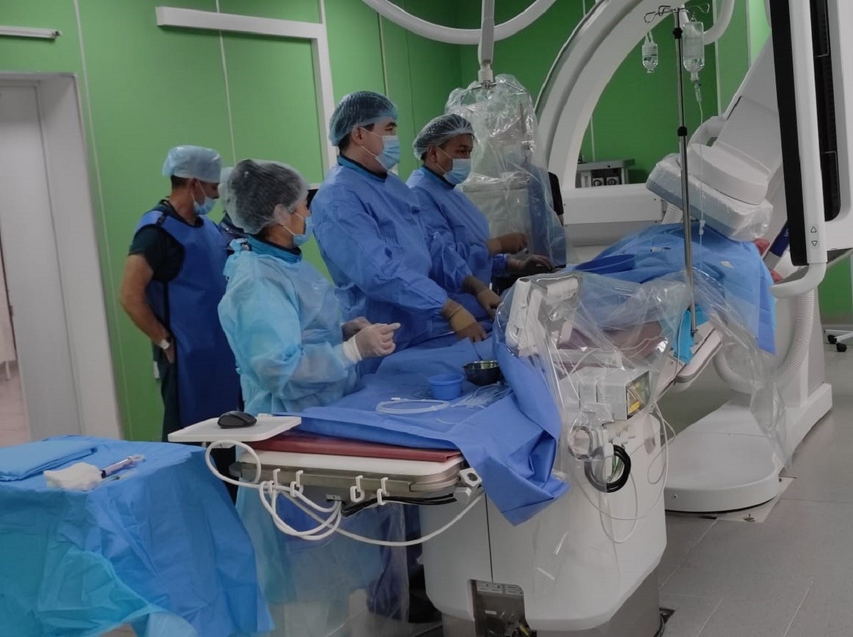 «С открытием данного отделения мы теперь можем оказывать плановую интервенционную кардиологическую медицинскую помощь, т.е проводить малоинвазивные хирургические вмешательства на сосуды сердца в рамках ГОБМП и ОСМС, совершенно бесплатно. Коронарография и стентирование коронарных артерий проводится при полном сознании пациента через прокол артерии на ноге или руке, посредством которой к сосудам сердца проводится катетер и контраст, что позволяет под рентгеном видеть всю картину коронарного русла. Операция прошла успешно, без осложнений, сейчас пациентка находится в стационаре, где получает консервативную терапию. В последующем в отделении будут проводиться аритмологические интервенционные вмешательства»,- отметил кардиолог.