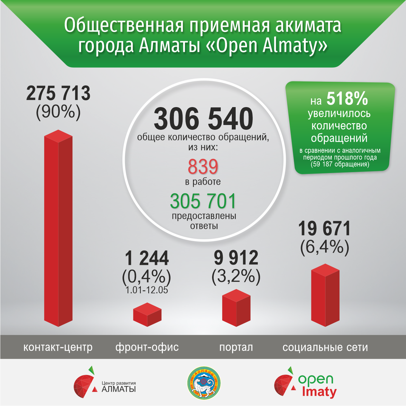 В сравнении с аналогичным периодом 2019 года количество обращений увеличилось на 518%. Причина роста показателя – введенный режим карантина в г. Алматы. С 16 марта Open Almaty функционирует в качестве контакт-центра, оперативно консультирующего горожан о принимаемых властями мерах по противодействию распространения коронавирусной инфекции. При этом не прекращается приём и регистрация обращений по различным направлениям жизнедеятельности города: благоустройство, обрезка деревьев и уборка мусора, ремонт дорог и замена инженерных сетей, получение направлений в детские сады и иные обращения, которые относятся к компетенции акимата города.