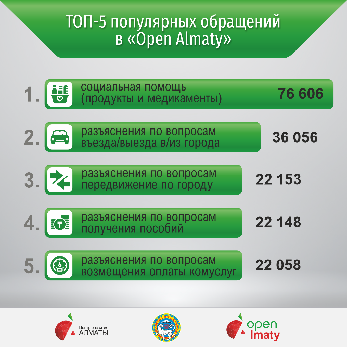 Топ-5 обращений выглядит следующим образом: заявки жителей на социальную помощь продуктами и медикаментами (76,6 тыс.), разъяснения по вопросам въезда/выезда в/из Алматы (36 тыс.), передвижения по Алматы (22,2 тыс.), получению пособий (22,1 тыс.) и возмещения оплаты коммунальных услуг (22 тыс.).