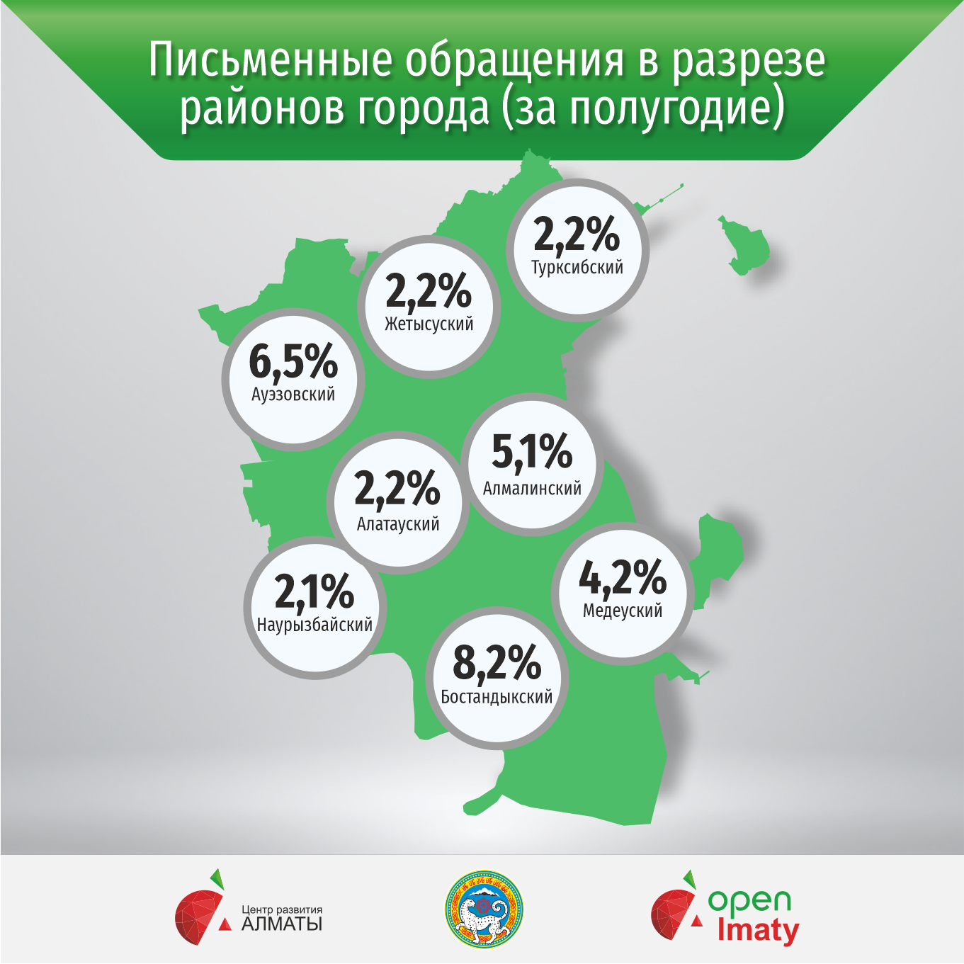 Наибольшее количество письменных обращений в разрезе районов города поступило в адрес аппарата акима Бостандыкского района — 8,2% от общего числа всех письменных обращений за полугодие. Далее следуют аппараты акимов Ауэзовского (6,5%), Алмалинского (5,1%), Медеуского (4,2%), Алатауского, Жетысуского (2,2%), Турксибского (2,2%) и Наурызбайского районов (2,1%).