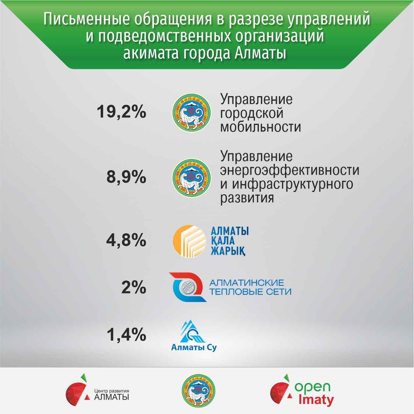 В разрезе управлений и подведомственных организаций акимата Алматы больше всего письменных обращений поступило в адрес Управления городской мобильности (19,2%), Управления энергоэффективности и инфраструктурного развития (8,9%), а также Алматы Қала Жарық (4,8%), Алматинские тепловые сети (2%) и Алматы Су (1,4%).