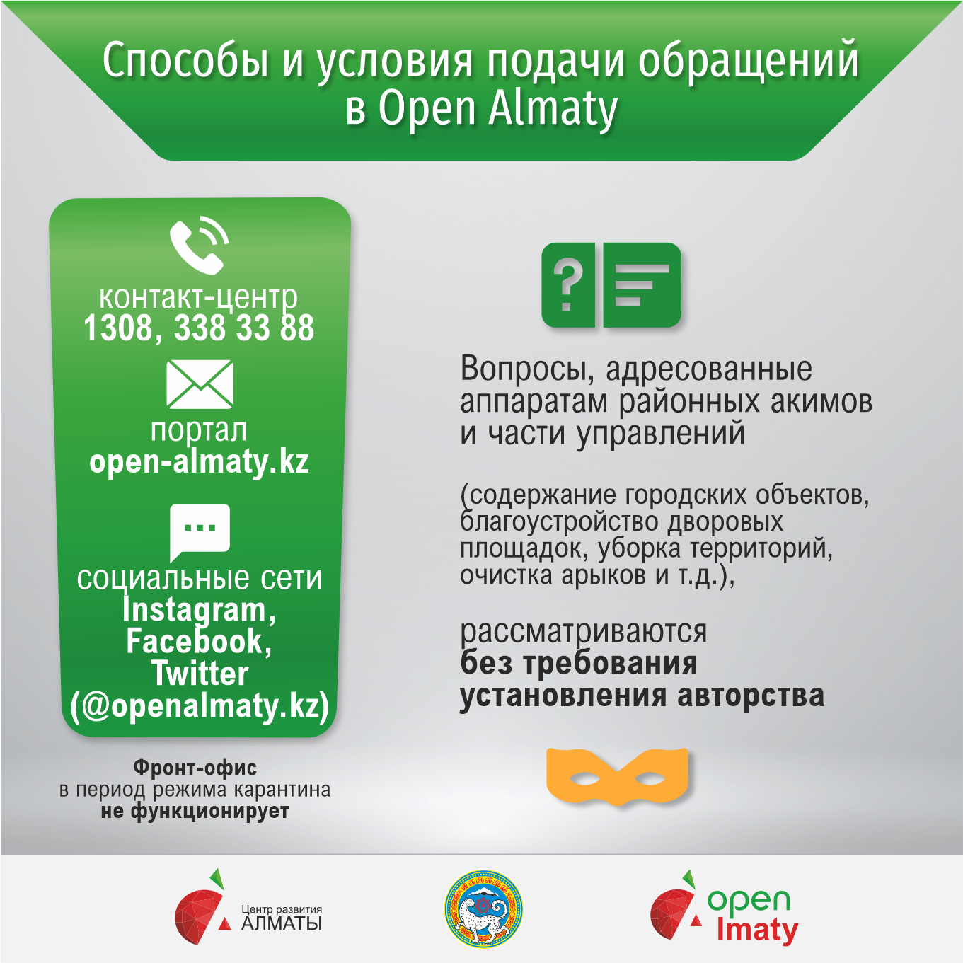 Сегодня жителям и гостям города доступны следующие способы подачи обращений в Open Almaty: контакт-центр 1308, 338 33 88, портал open-almaty.kz и социальные сети Instagram, Facebook, Twitter (@openalmaty.kz). Фронт-офис в период режима карантина не функционирует.