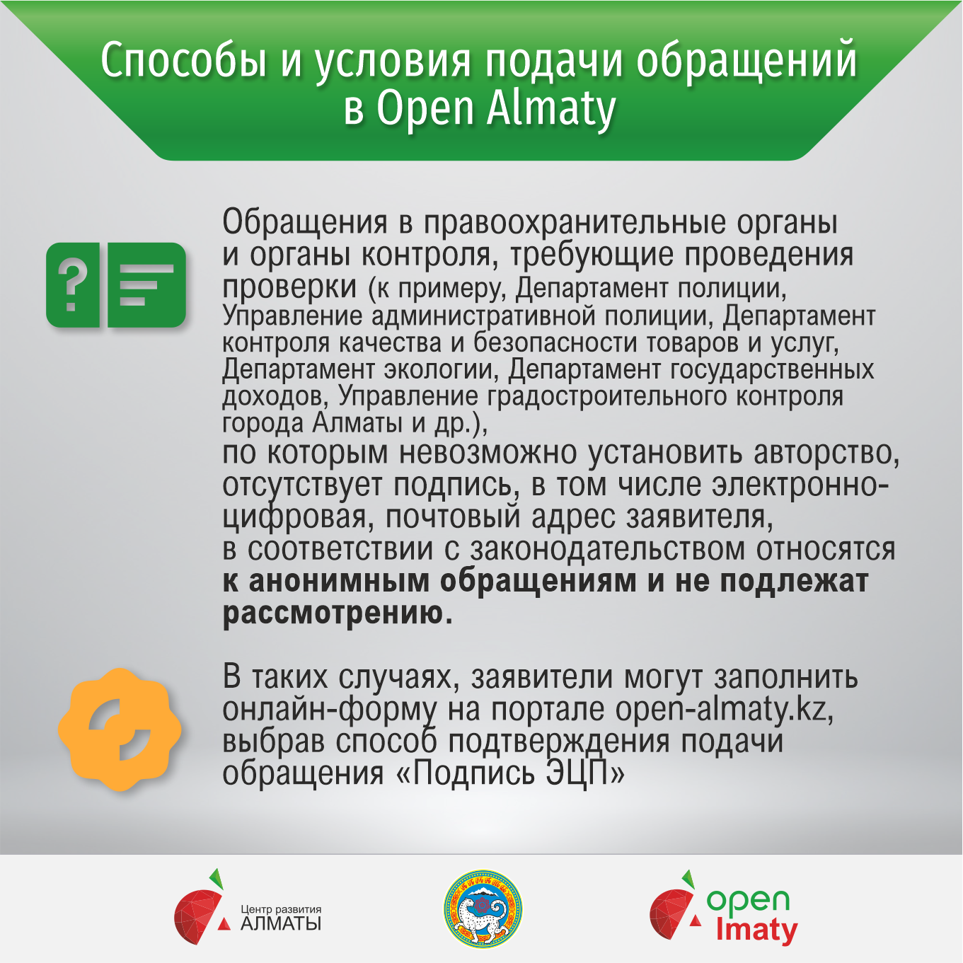 Обращения в правоохранительные органы и органы контроля, требующие проведения проверки (к примеру, Департамент полиции, Управление административной полиции, Департамент контроля качества и безопасности товаров и услуг, Департамент экологии, Департамент государственных доходов, Управление градостроительного контроля города Алматы и др.), по которым невозможно установить авторство, отсутствует подпись, в том числе электронно-цифровая, почтовый адрес заявителя, в соответствии с законодательством относятся к анонимным обращениям и не подлежат рассмотрению. В таких случаях, заявители могут заполнить онлайн-форму на портале open-almaty.kz, выбрав способ подтверждения подачи обращения «Подпись ЭЦП».